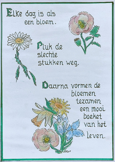 Leest u een mooi en inspirerend gedicht geef het eens door aan een ander. Een 95 jarige gaf aan één van ons het afgebeelde door haarzelf gemaakte gedicht door. Ze maakte er zelf de decoratie bij.