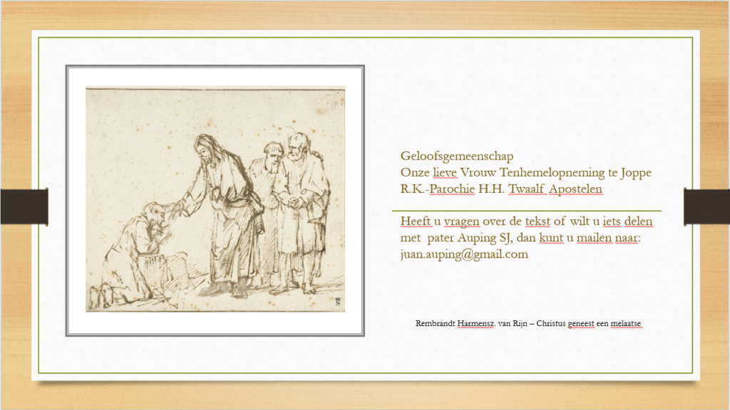 Tijdens het bezoek van pater John Auping SJ uit Mexico – opgegroeid in Joppe – in september 2018 aan onze geloofsgemeenschap om met ons het 150-jarig jubileumfeest te vieren is het idee geboren contact met elkaar te houden. We mochten vele prachtige uitgebreide overwegingen ontvangen van pater Auping maar we gaan verder in een verkorte vorm.