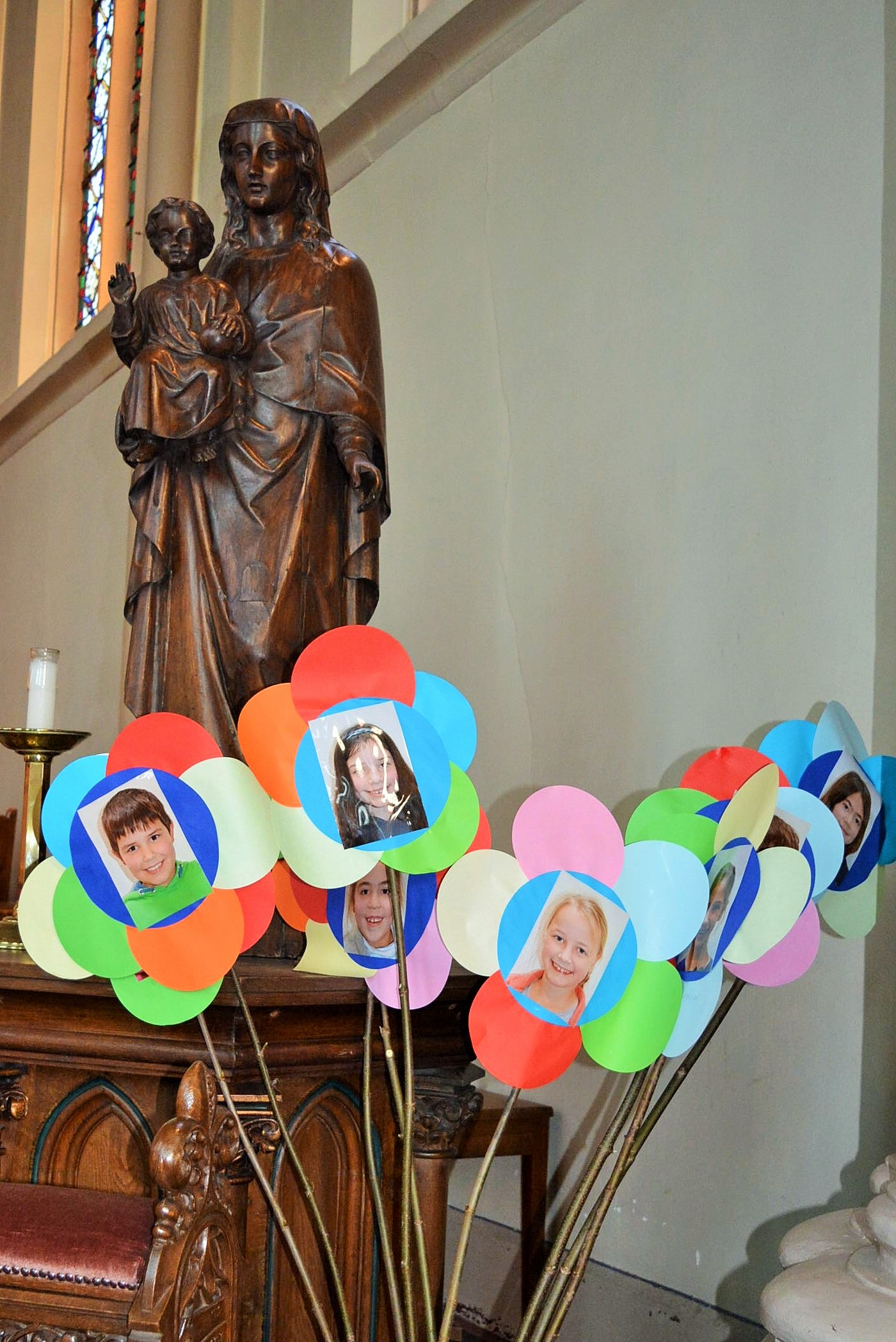 Tijdens de familieviering op 15 februari hebben de communicanten uit Joppe zich al aan onze geloofsgemeenschap voorgesteld. De bloemen met hun foto staan voor in de kerk bij het Mariabeeld.