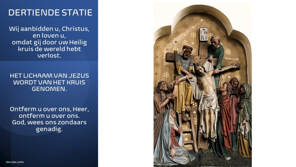 Op weg naar de Goede Week en Pasen ontvangt u met regelmaat teksten van pater P. Penning de Vries SJ met één beeld van een kruiswegstatie uit de Joppekerk. De kruisweg telt veertien lijdenstaferelen, de zogenoemde staties.