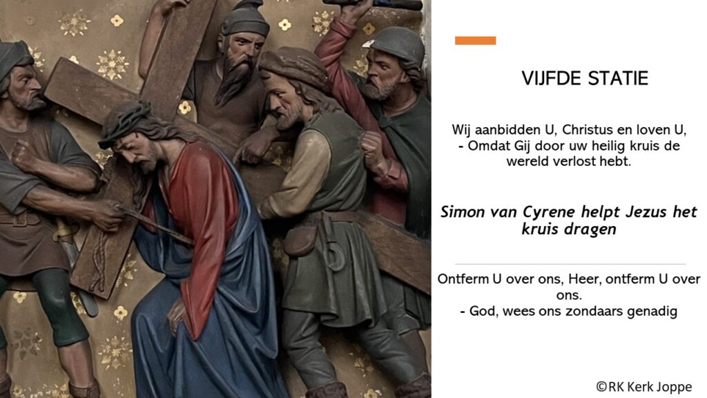 Op weg naar de Goede Week en Pasen ontvangt u met regelmaat teksten van pater P. Penning de Vries SJ met één beeld van een kruiswegstatie uit de Joppekerk. De kruisweg telt veertien lijdenstaferelen, de zogenoemde staties.