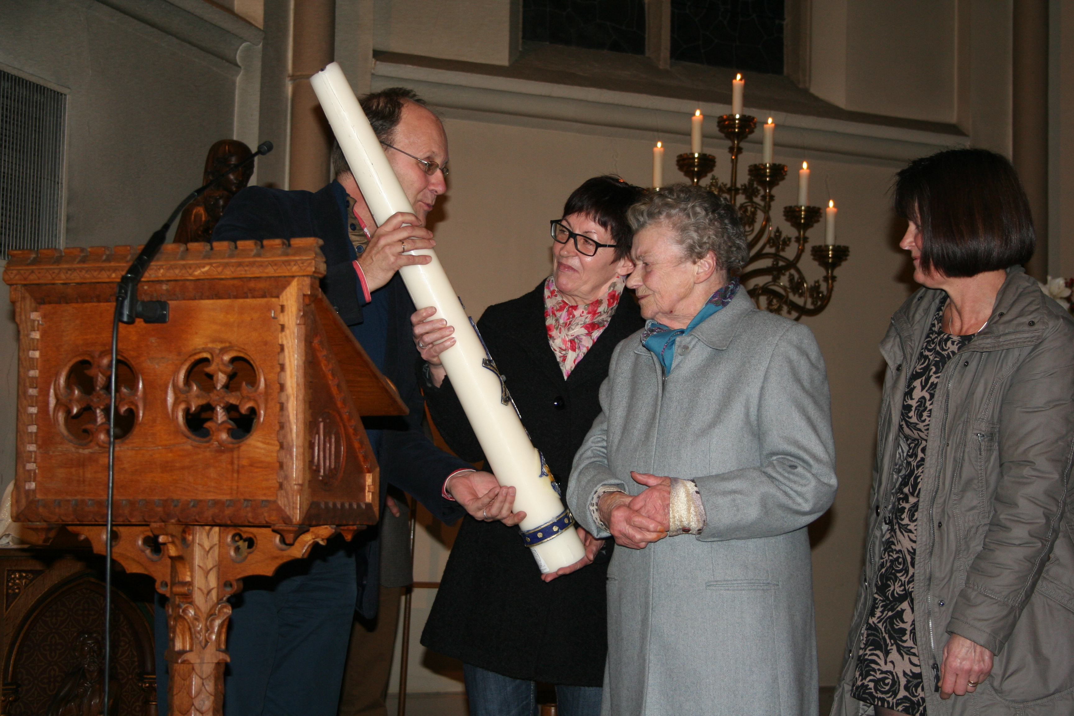 In haar danken wij alle parochianen die achter de schermen, vaak in stilte, veel taken uitvoeren. Als dank voor al het kerkelijk werk ontving zij de Paaskaars.